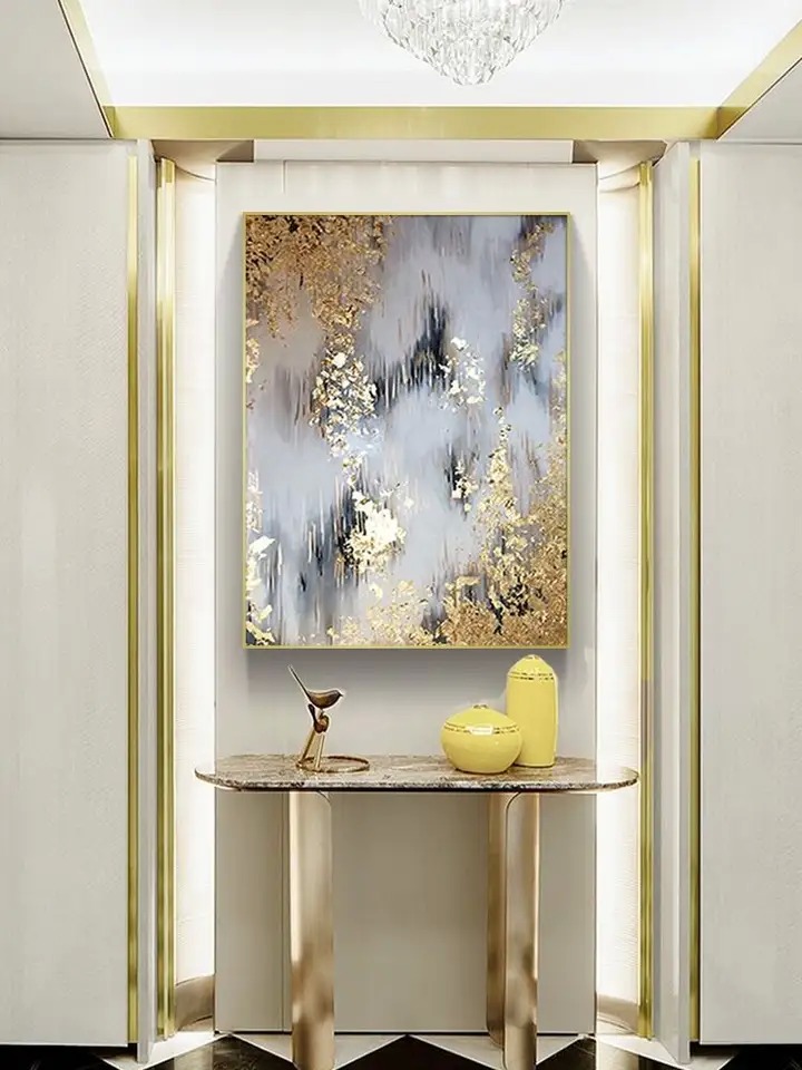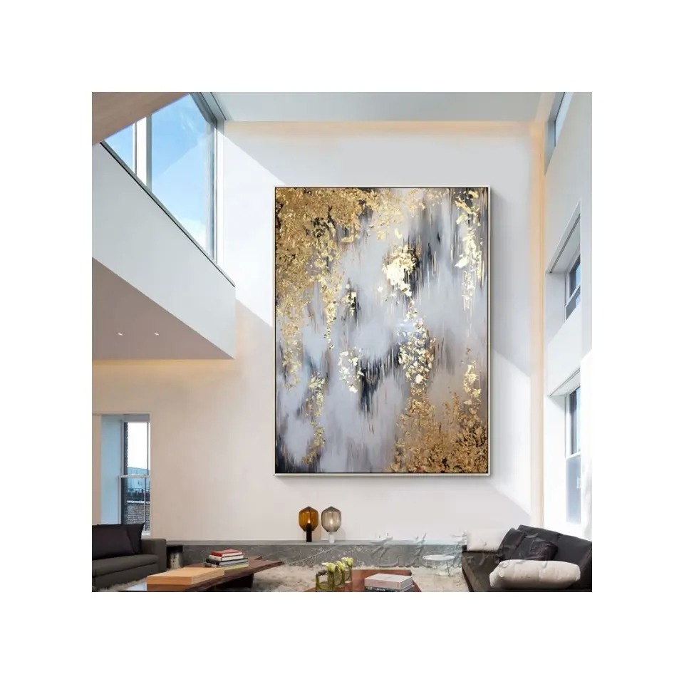 थोक अमूर्त कैनवास दीवार सजावट में स्वर्ण अमूर्त पन्नी उच्चारण के साथ हाथ से चित्रित तेल चित्र हैं। प्रत्येक टुकड़ा 100% पर्यावरण के अनुकूल सामग्री और पारंपरिक तकनीकों का उपयोग करके हस्तनिर्मित है।